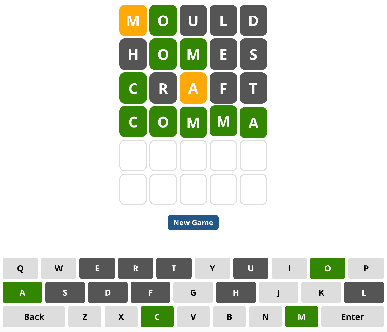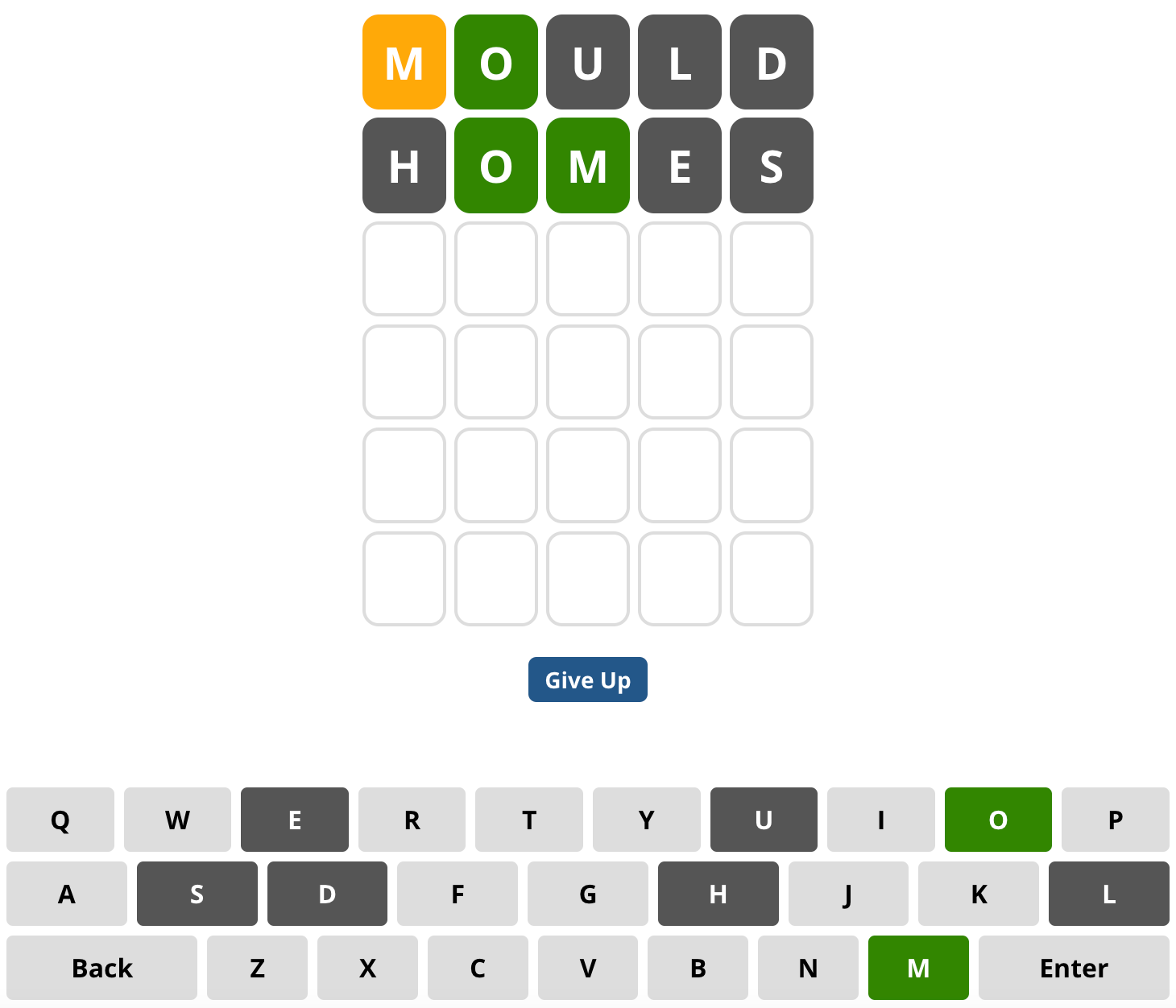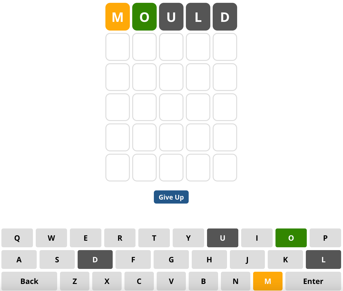 It wasn't the correct word, but we've already guessed “O” in the correct position, as its cell was highlighted in green! Also, We have a yellow “M” meaning, that this letter is included within the word, but in a different position. And on top of that, we can exclude any 5-letter words with the letters “U”, “L” and “D”